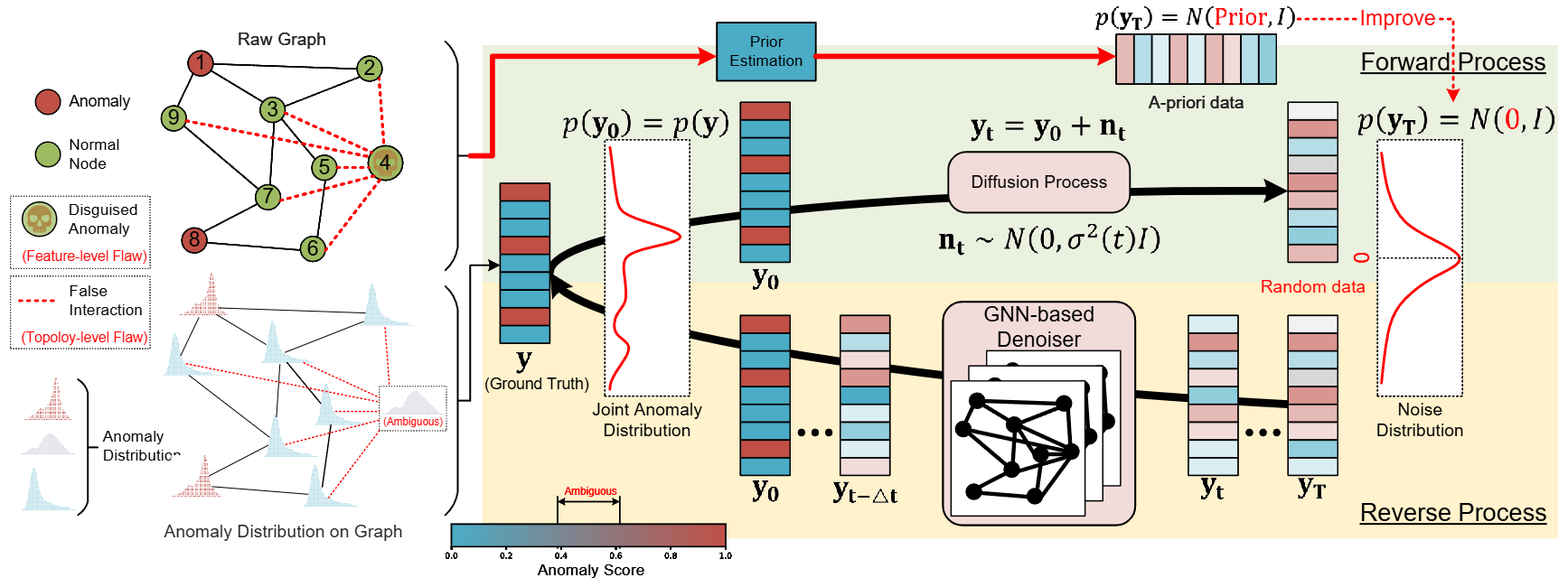 Graph anomaly detection (GAD) has become a critical research area, with successful applications in financial fraud and telecommunications. Traditional Graph Neural Networks (GNNs) face significant challenges: at the topology level, they suffer from over-smoothing that averages out anomalous signals; at the feature level, discriminative models struggle when fraudulent nodes obfuscate their features to evade detection. In this paper, we propose a Conditional Graph Anomaly Diffusion Model (CGADM) that addresses these issues through the iterative refinement and denoising reconstruction properties of diffusion models. Our approach incorporates a prior-guided diffusion process that injects a pre-trained conditional anomaly estimator into both forward and reverse diffusion chains, enabling more accurate anomaly detection. For computational efficiency on large-scale graphs, we introduce a prior confidence-aware mechanism that adaptively determines the number of reverse denoising steps based on prior confidence. Experimental results on benchmark datasets demonstrate that CGADM achieves state-of-the-art performance while maintaining significant computational advantages for large-scale graph applications.